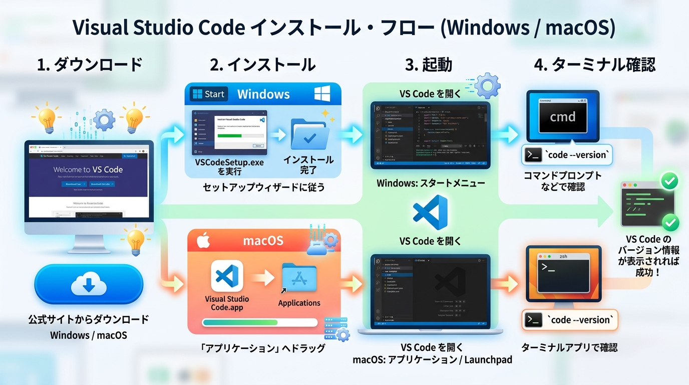 この Atom では、プログラムを書くための「作業台」となるエディタ VS Code(Visual Studio Code)をパソコンにインストールし、AI ツールを使った開発にすぐ取りかかれる状態にします。料理にたとえると、「まな板と包丁をキッチンに揃える」ステップです。ここが終われば、次の Atom からコードを書き始められます。