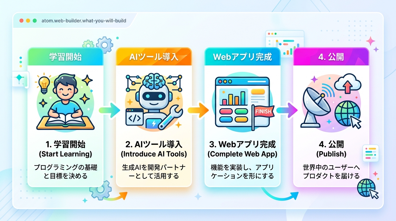 このトラック(=学習コースのこと)が終わると、あなたは AI の力を借りて、自分だけの Web アプリ(=インターネット上で動く便利なツール)を1つ作れるようになります。プログラミングの経験は一切不要です。